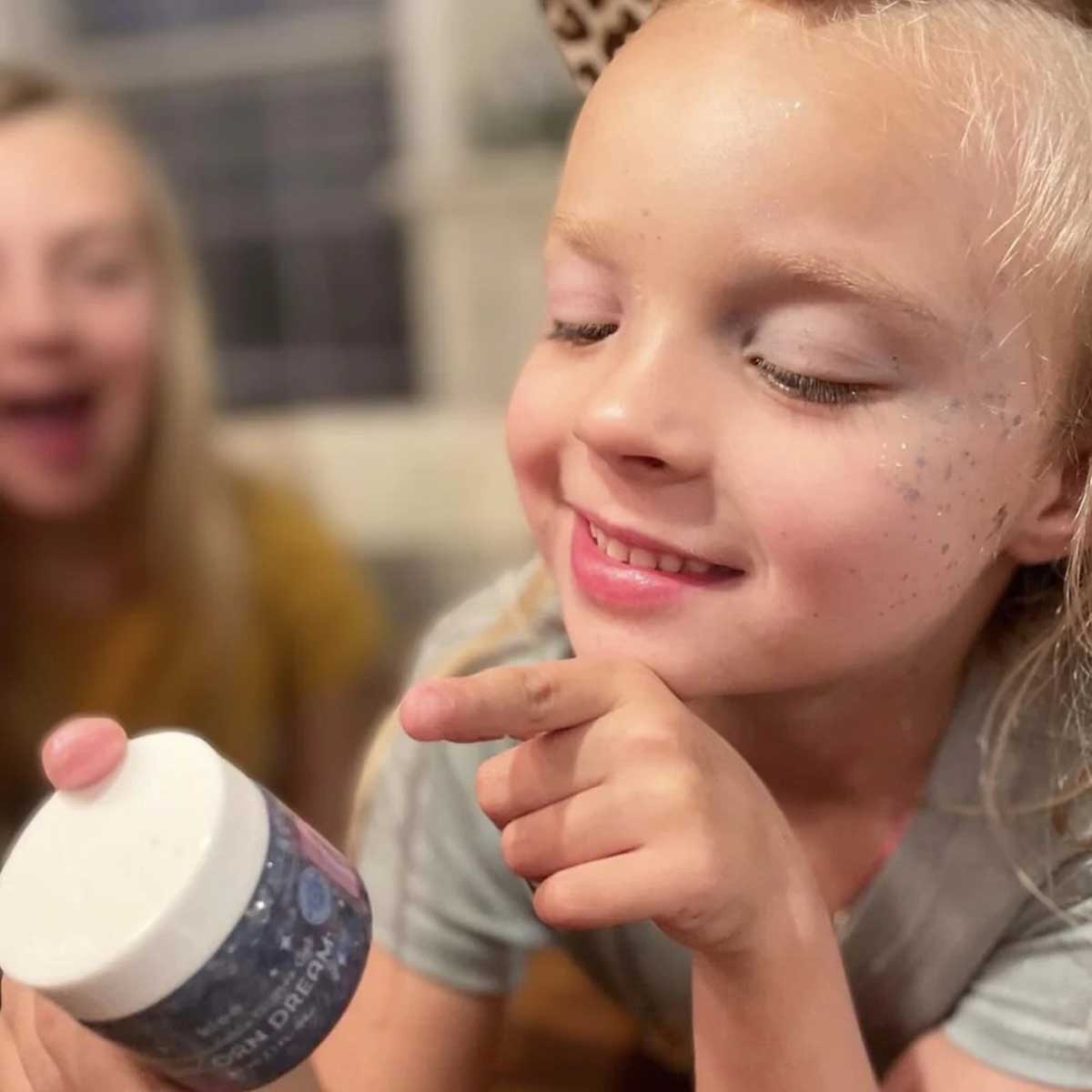 This gentle, age-appropriate kit includes ballerina pink Jackson water-based peelable nail polish, juicy Strawberry Kiss lip shimmer, and Pink Glitterbug biodegradable glitter gel made from plant-based glitter.