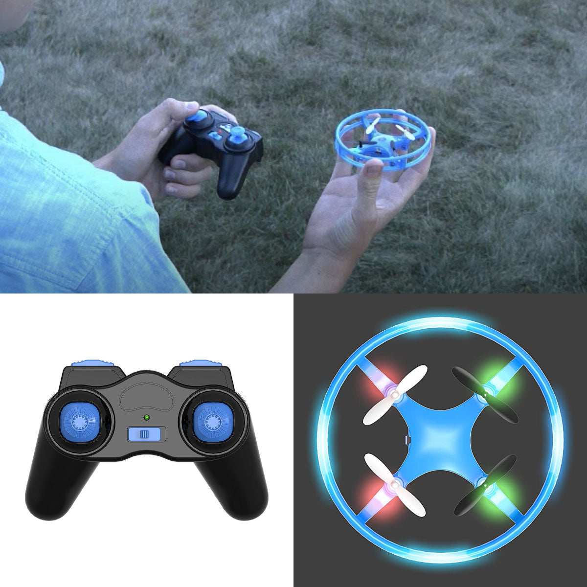 Take to the skies! This little quad-copter ring drone is quick, easy to maneuver, and lights up the night with LEDs. Sky Lighter Glow Disc Drone comes with USB charging cable, extra blades, and remote control.