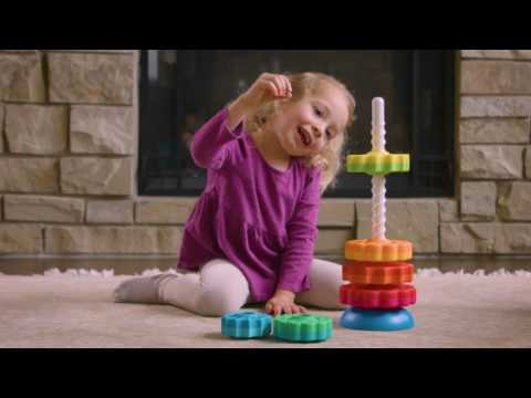 Sure, it looks like a normal ring stacker...but it's so much more than that! Drop the gear-shaped rings on the post, and they *spin* their way to the base. Grab the post, pick it up, and the base falls away, letting the gears spin off the end!