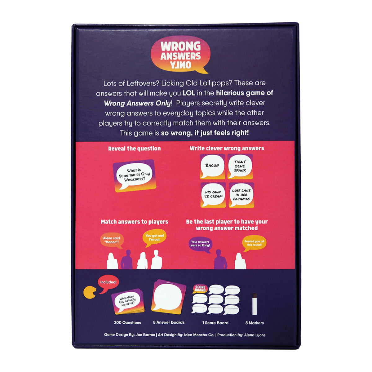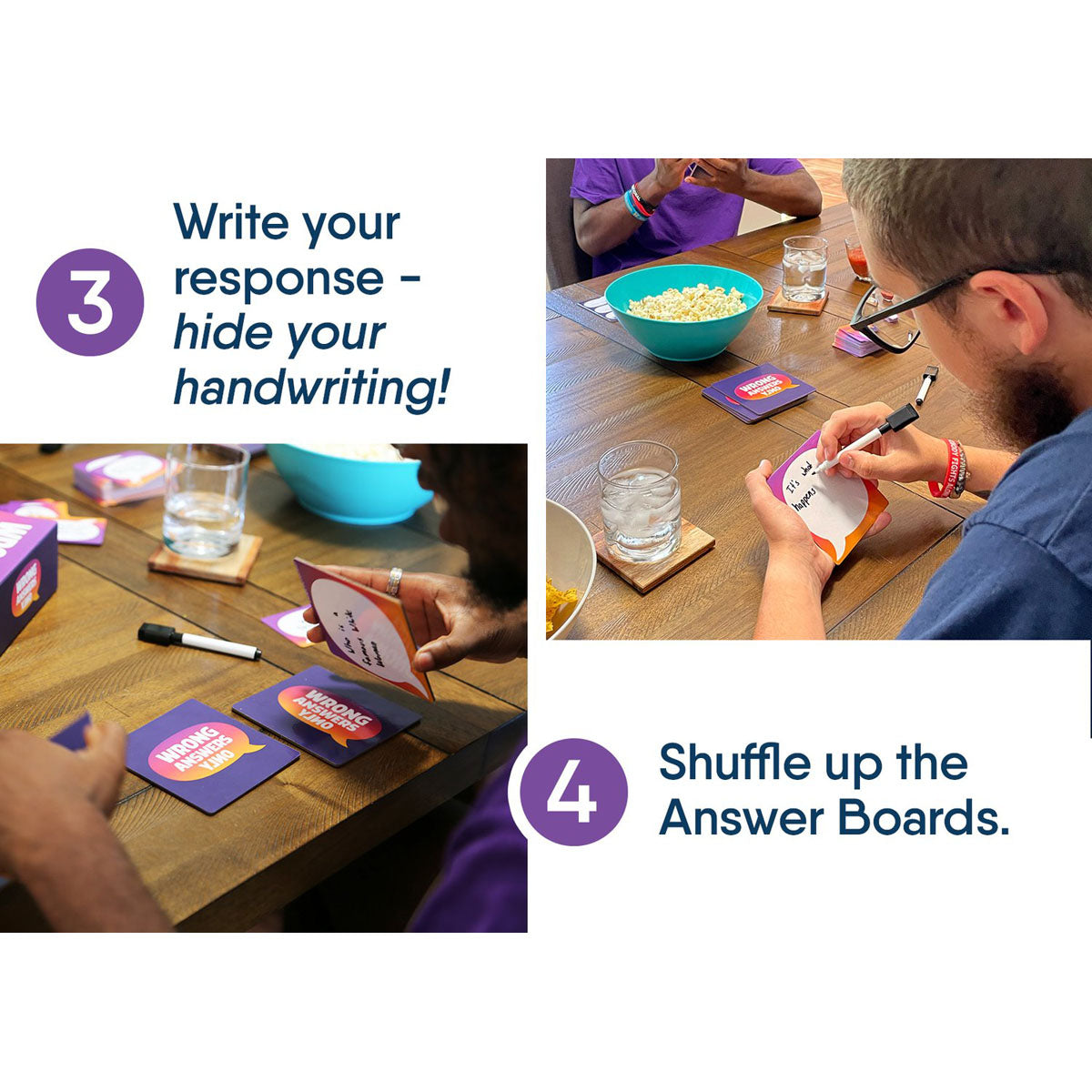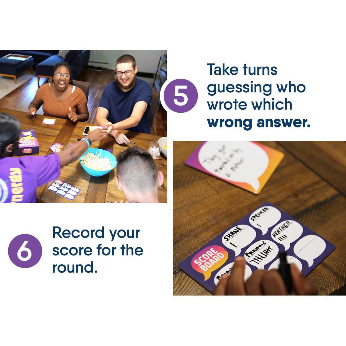In the game, players write clever wrong answers to everyday topics. Then the other players try to guess who wrote which wrong answer. Score points if you match answers to the right player!